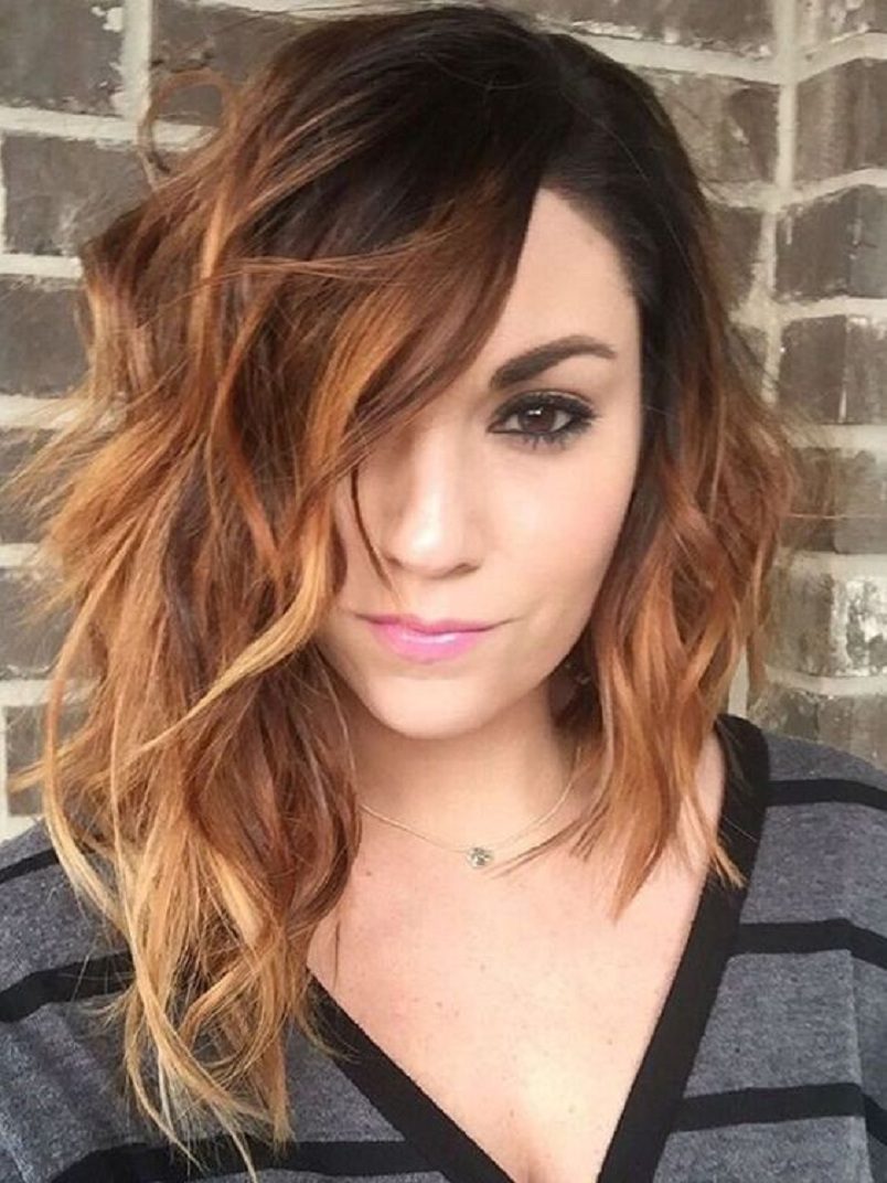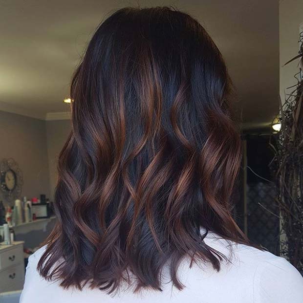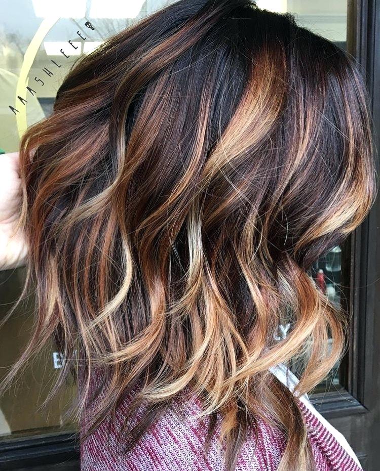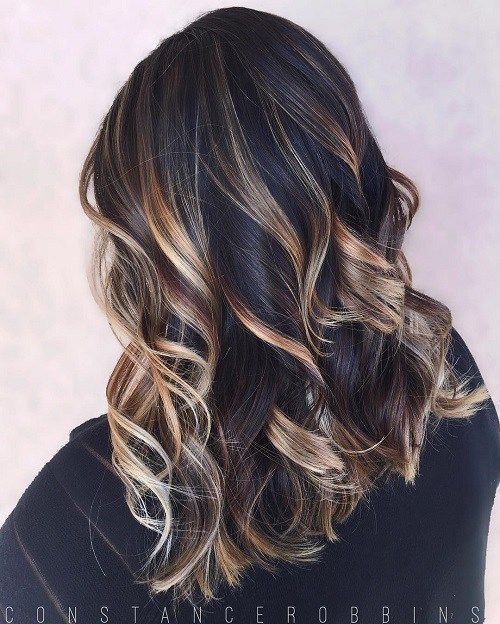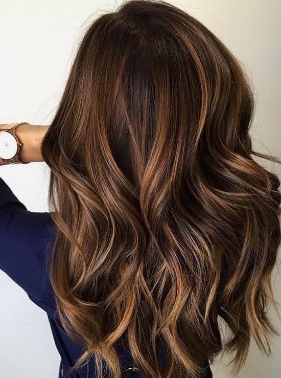 Beautiful dark hair will become even more attractive with the addition of warm straw and copper shades. The inclusion of several additional colors will make the hairstyle visually more lush, and a smooth overflow of color solutions will ensure the image of harmony.