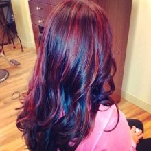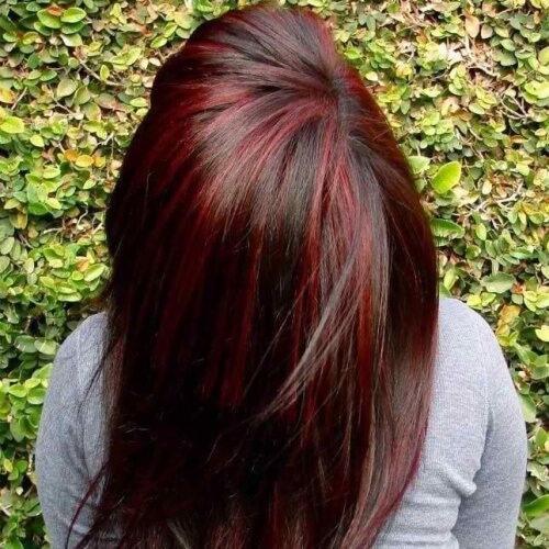 Today, quite popular and fashionable coloring on dark hair is a combination of natural color of hair with screaming eggplant, as well as poisonous red, cognac and honey color.