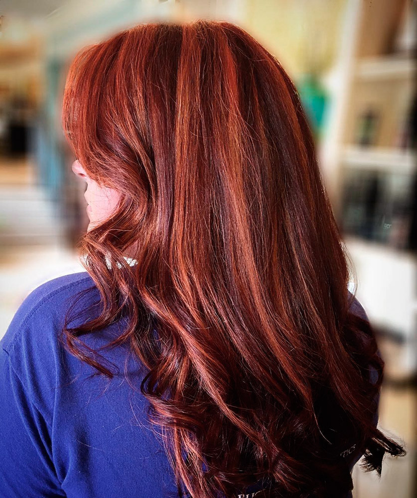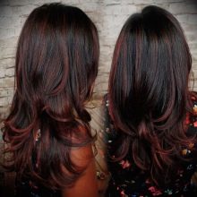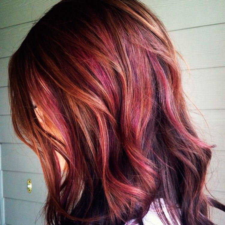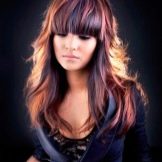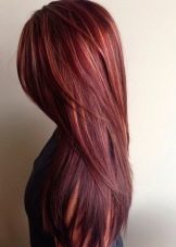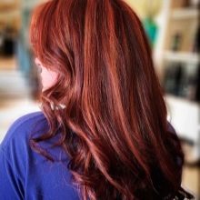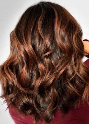 - Red The masters advise to refer to this kind of highlighting only to those young ladies who by nature have dark hair shades. Here colors like red, bronze, red or even brick-red are most often used. With the help of such scales one can noticeably revive the dark hair, without at the same time damaging the hair structure with aggressive clarifiers.