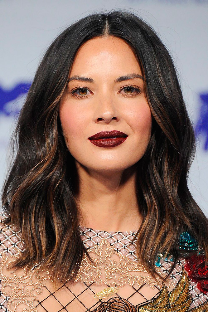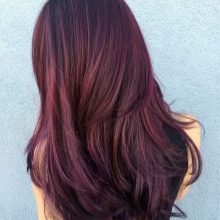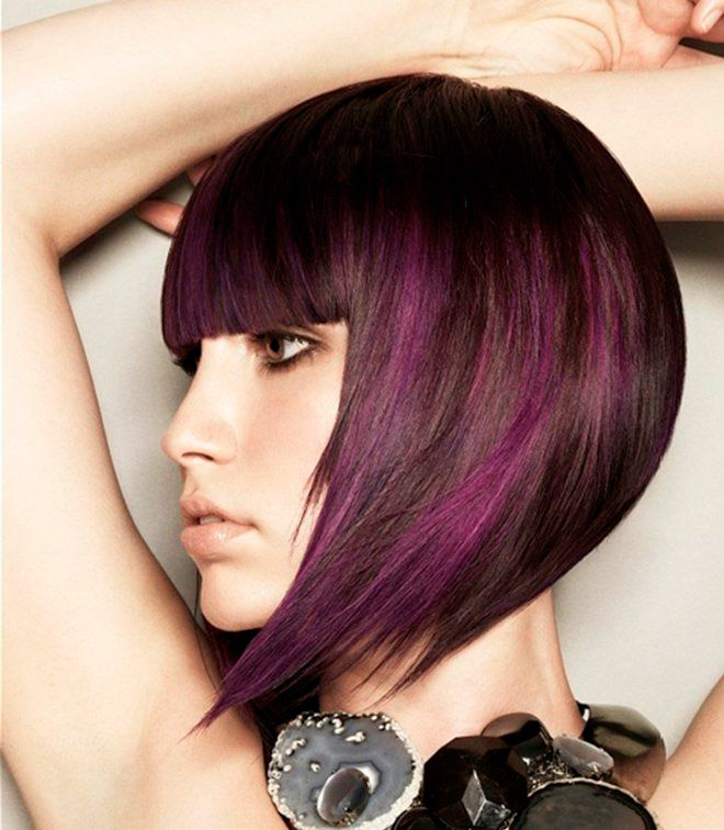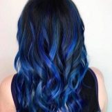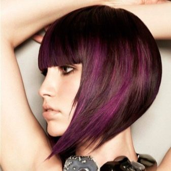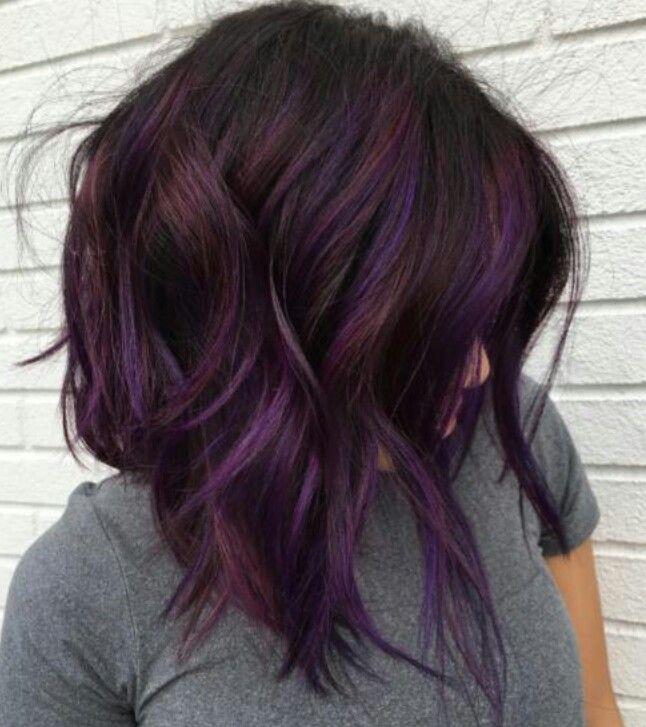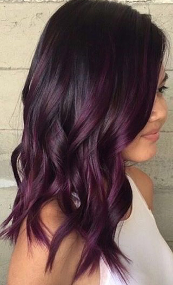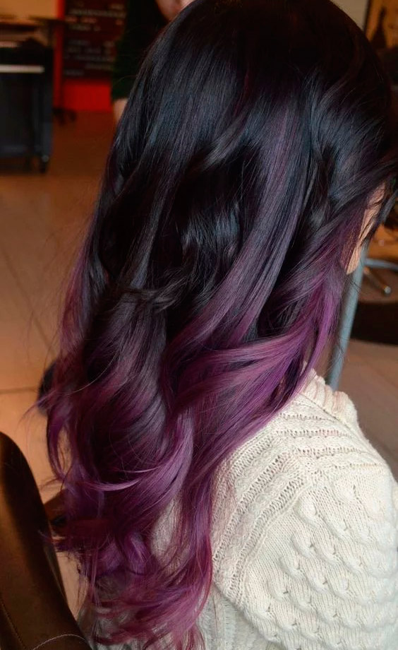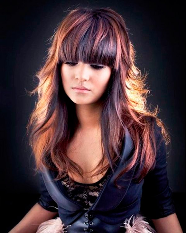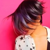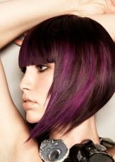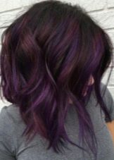 Highlighting on black hair using a violet hue is an excellent solution when it comes to dyeing long, large curls. Bangs may be laid on its side or absent altogether. The tips are permissible to make torn.