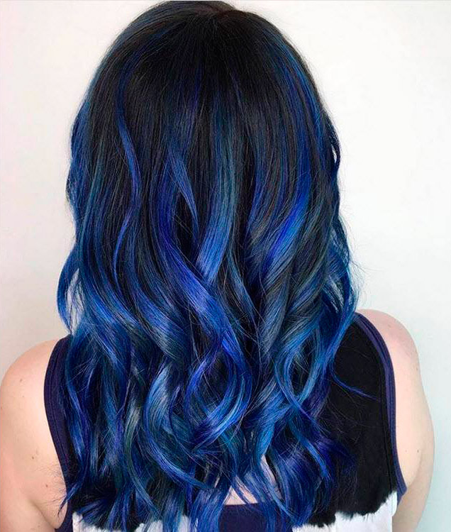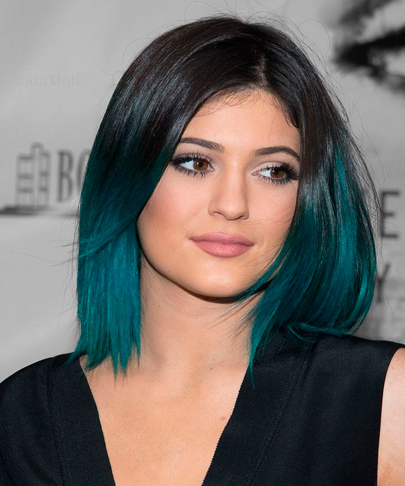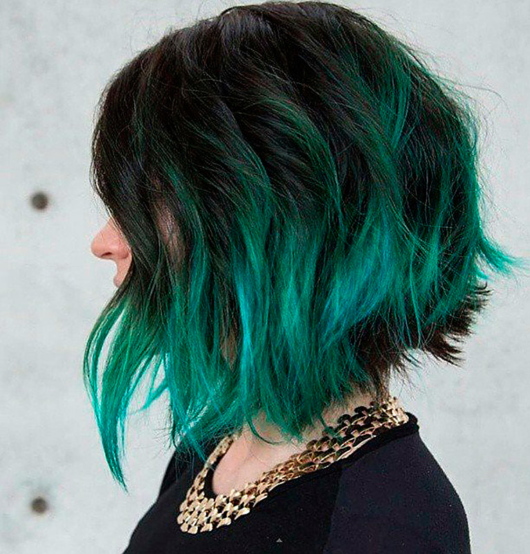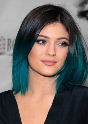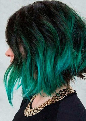On black short and medium hair color highlights look very interesting. For example, on an elegant black square without a bang, an ombre-type painting with turquoise ends painted to mid-length will look amazing.