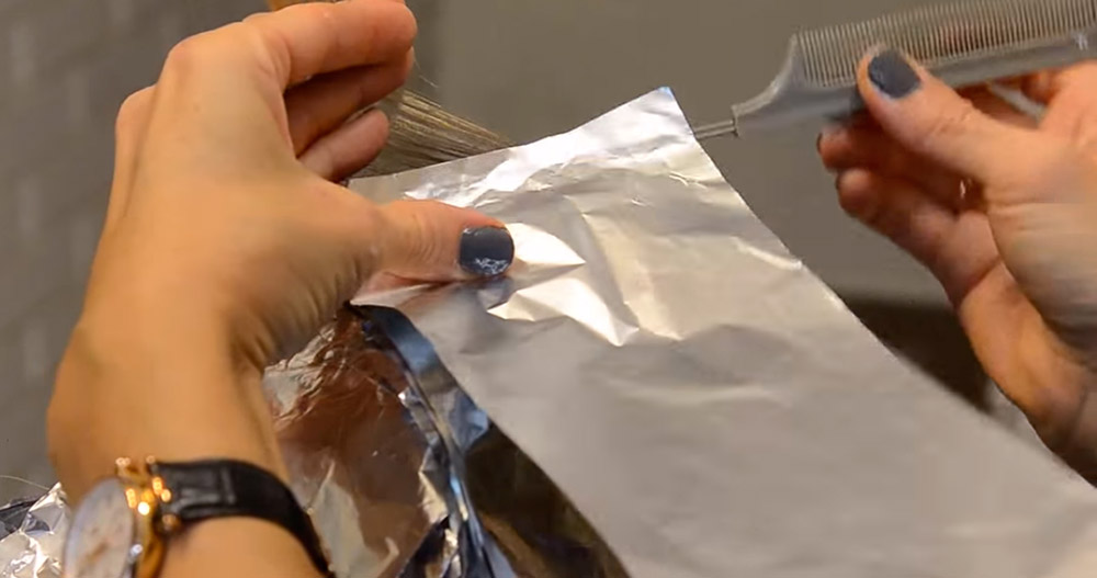 - After styling the hair, it is necessary to wrap the foil. After the occipital zone, you need to go to the temples (you need to start from the bottom). It is necessary to finish painting in the area of the crown.