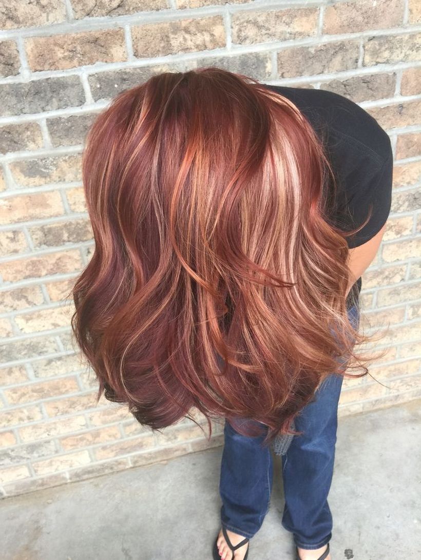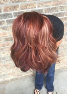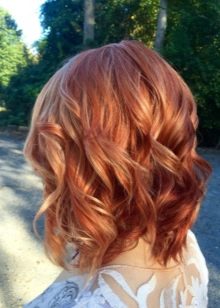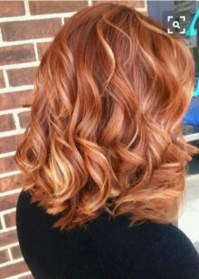 On the red curls will look stylish coloring of small strands in golden, wheat, and amber and cognac color.