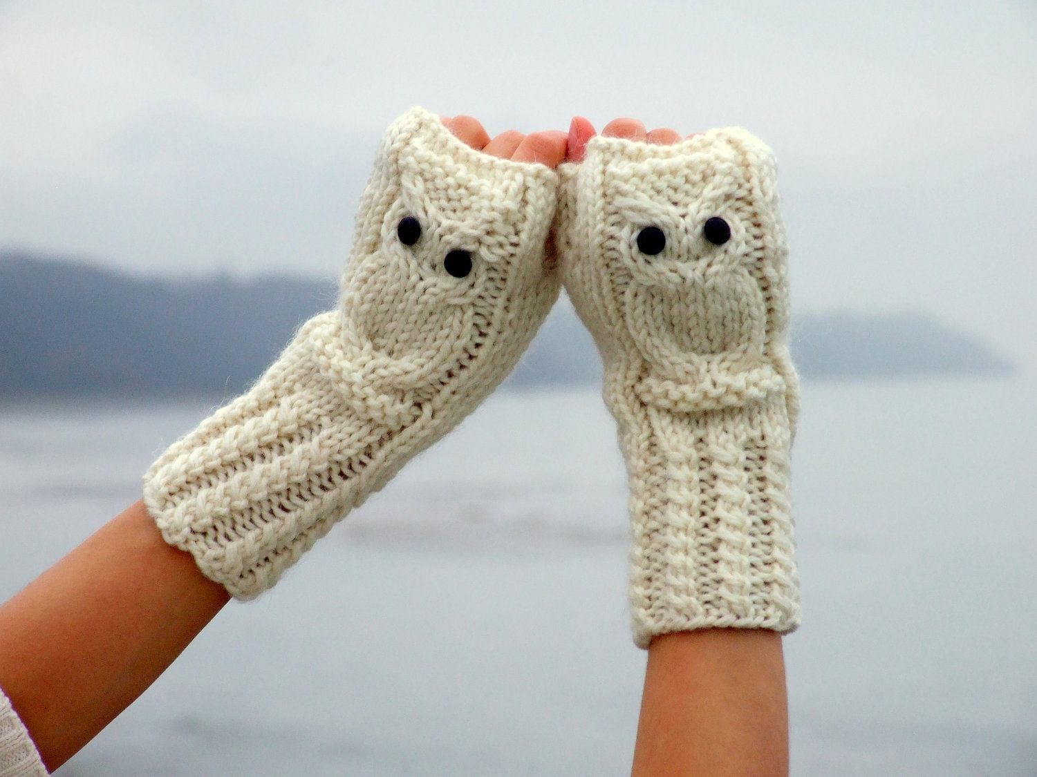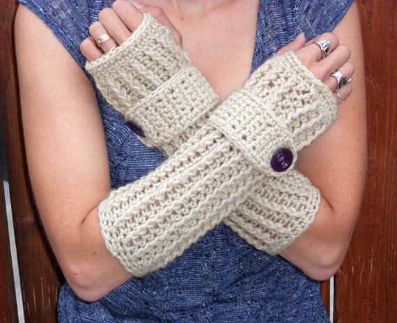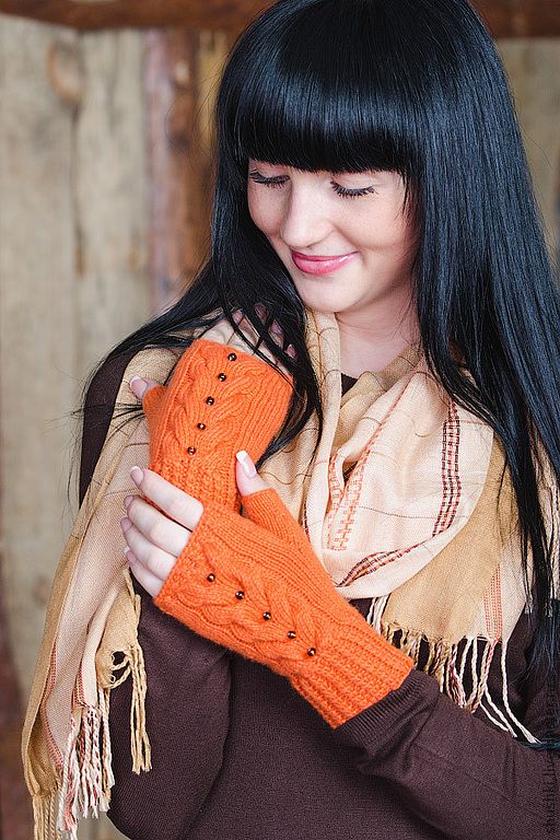 These mitts are made by skilled craftswomen. The product is knitted with needles, creating bulk wavy patterns in the process of knitting. The effect of the waves is obtained by making loops in a special way. These models look very stylish and fashionable. They are made of monophonic yarn or threads of several shades.