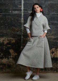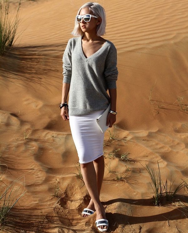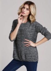 A gray pullover is a universal option that will be appropriate in any situation. If the dress seems boring to you, it can be easily revived with bright accessories.
