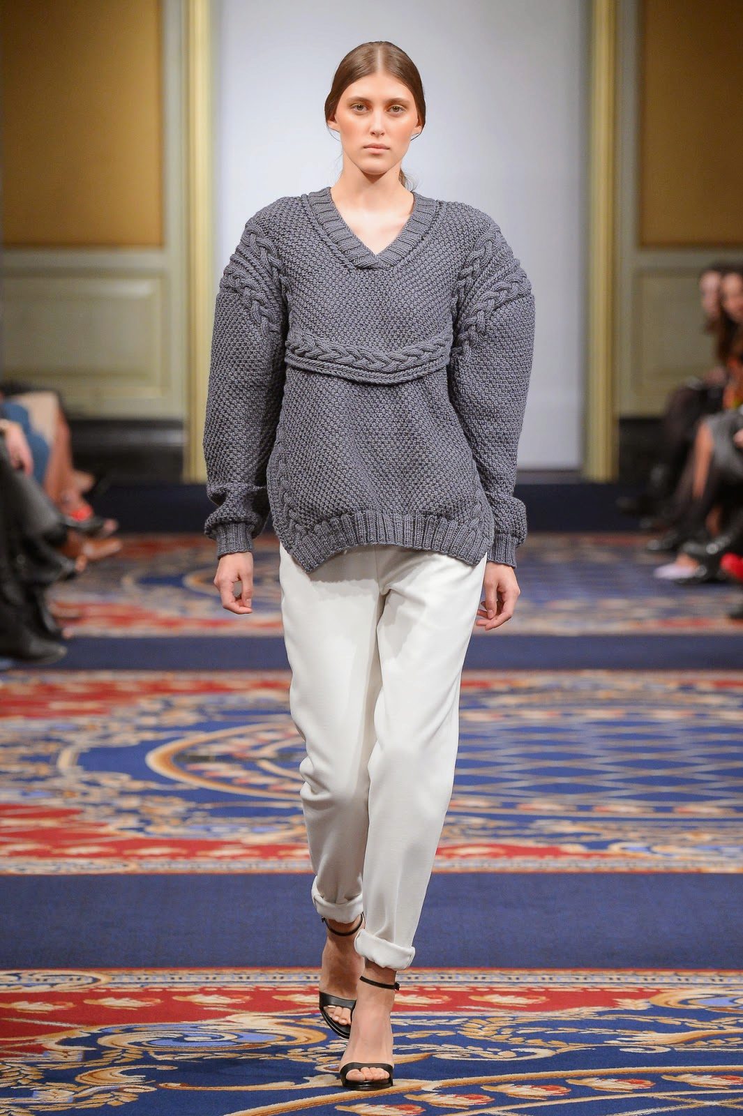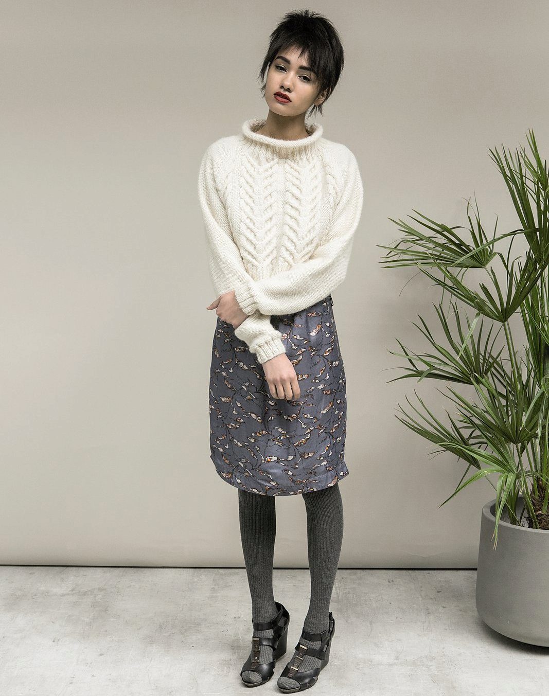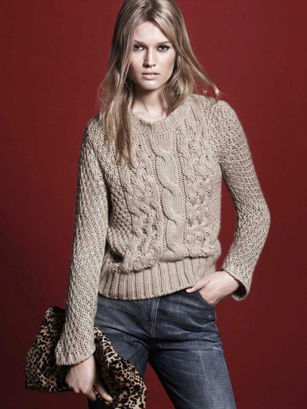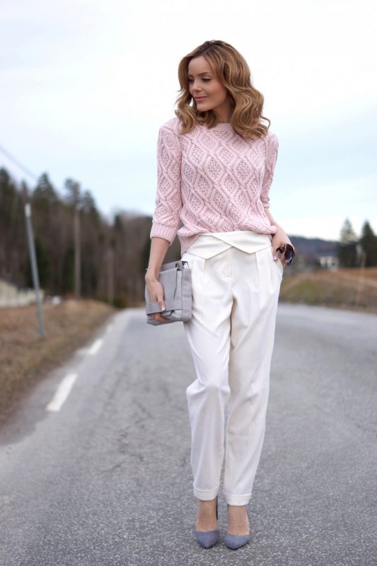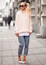- Tenderness and comfort: an oversized cream pullover with intricate braid patterns in combination with boyfriend jeans, a loose white shirt and classic shoes.