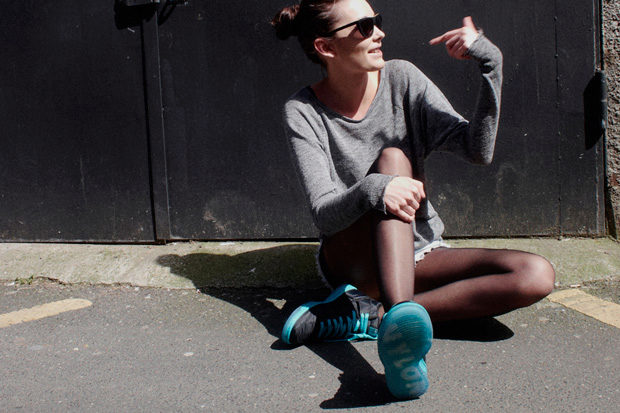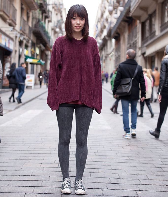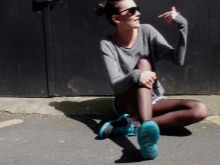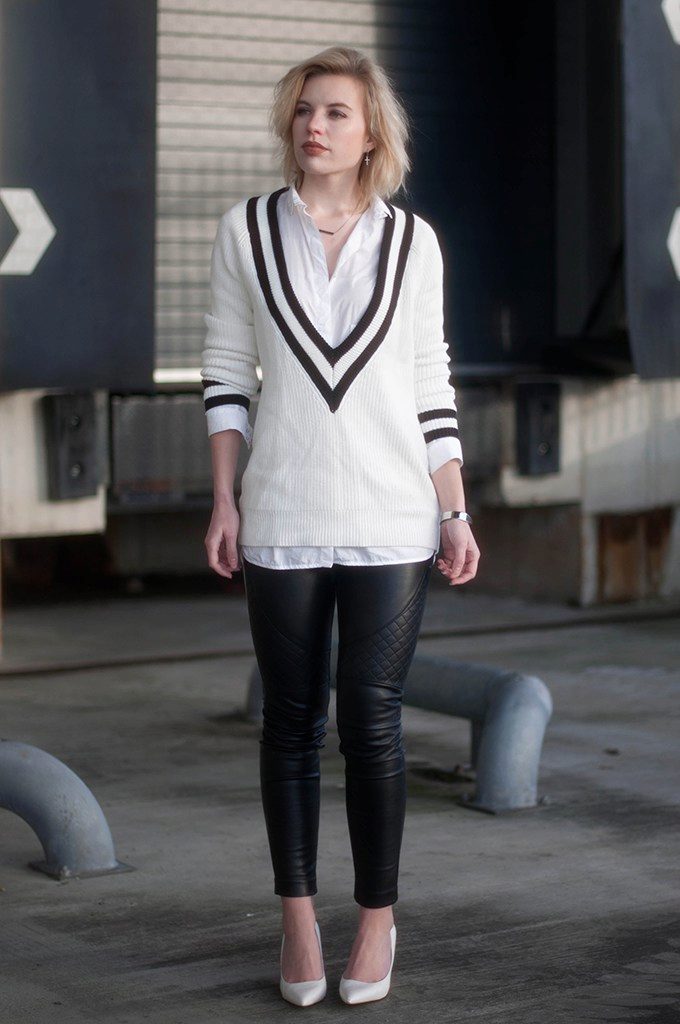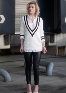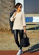 - Mixing styles: a white pullover with a textured pattern, tight-fitting black artificial leather leggings, a leather jacket, sports shoes, a roomy bag and white-framed sunglasses.