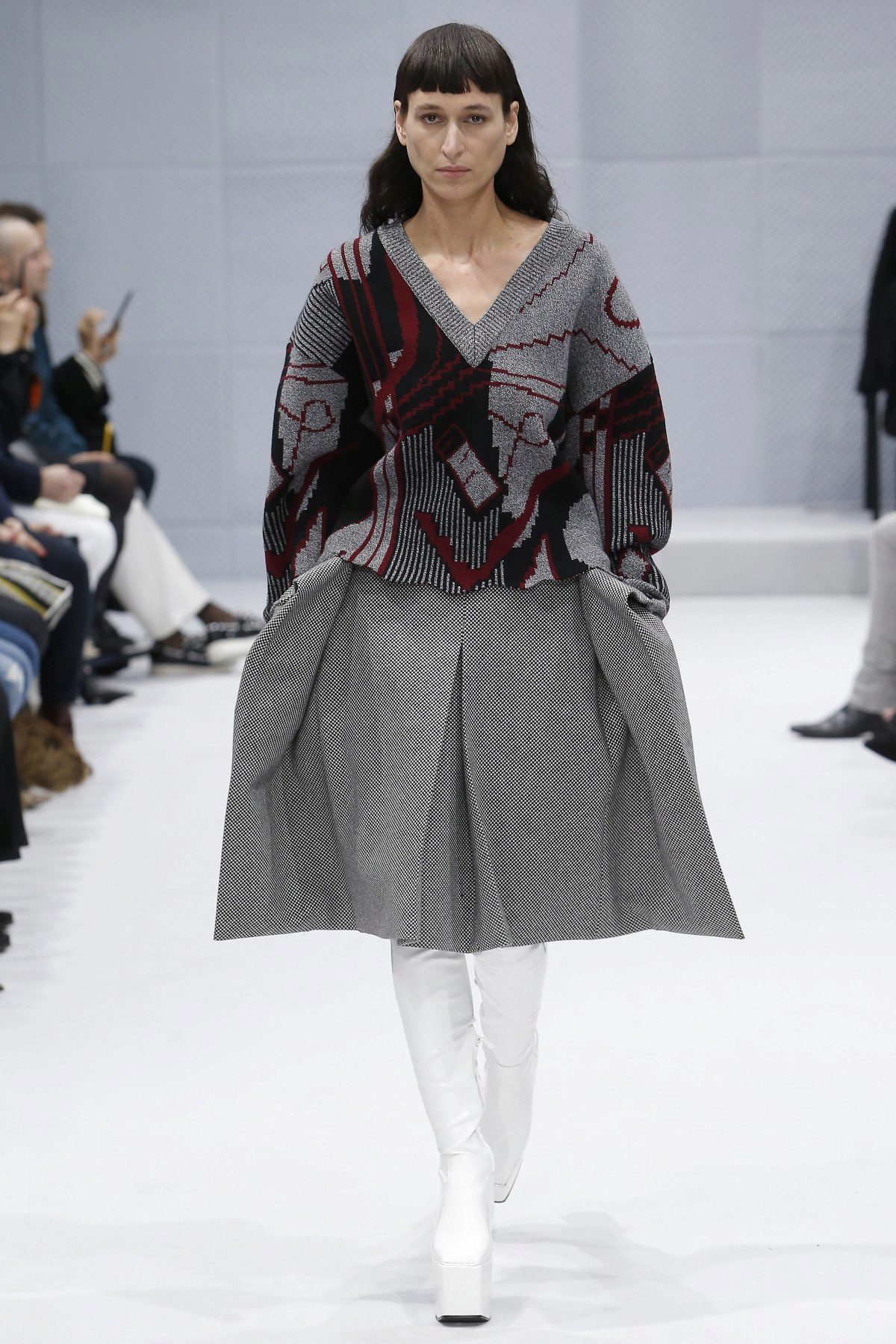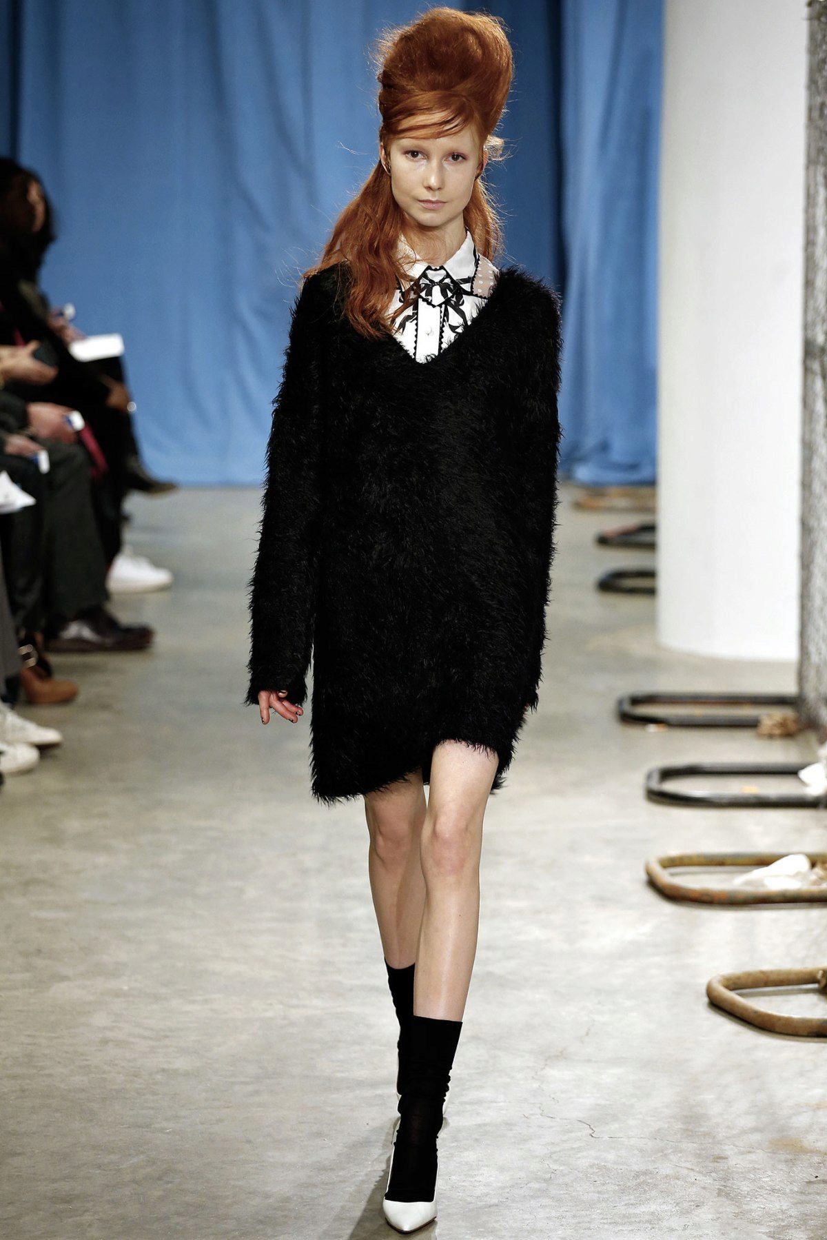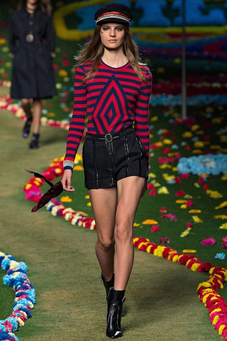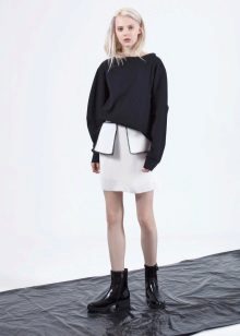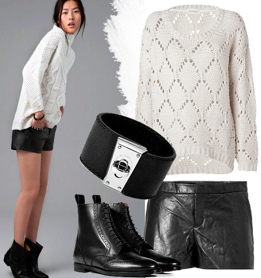 - Punk elements: a snow-white laced pullover with short leather shorts, high lace-up boots and embellishments in black leather and shiny metal.
