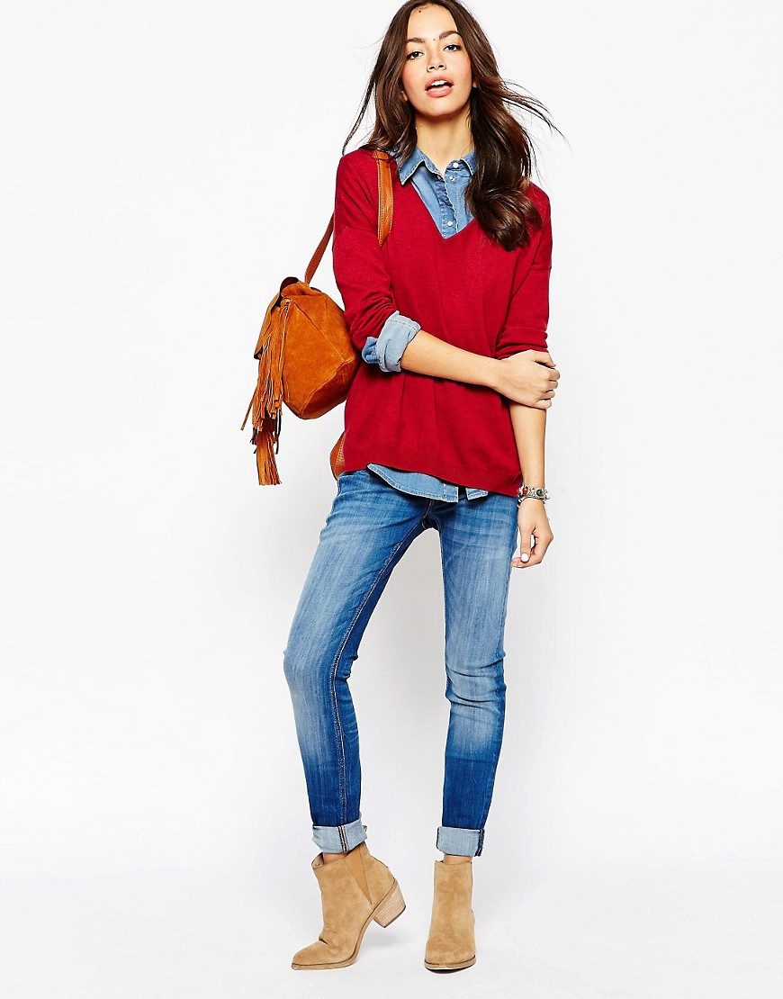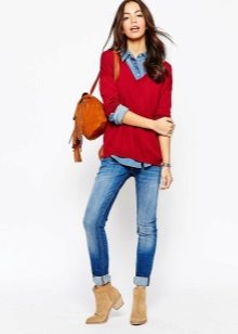 Pullover with jeans and a shirt - this combination is a classic style of casual. It is recommended to supplement the image with a stylish bag, comfortable shoes (for example, oxfords or loafers) and massive glasses.