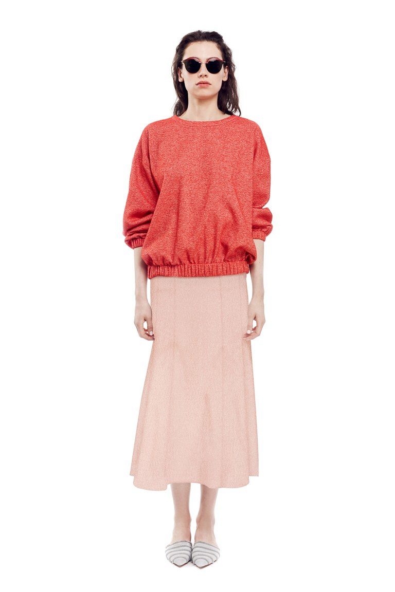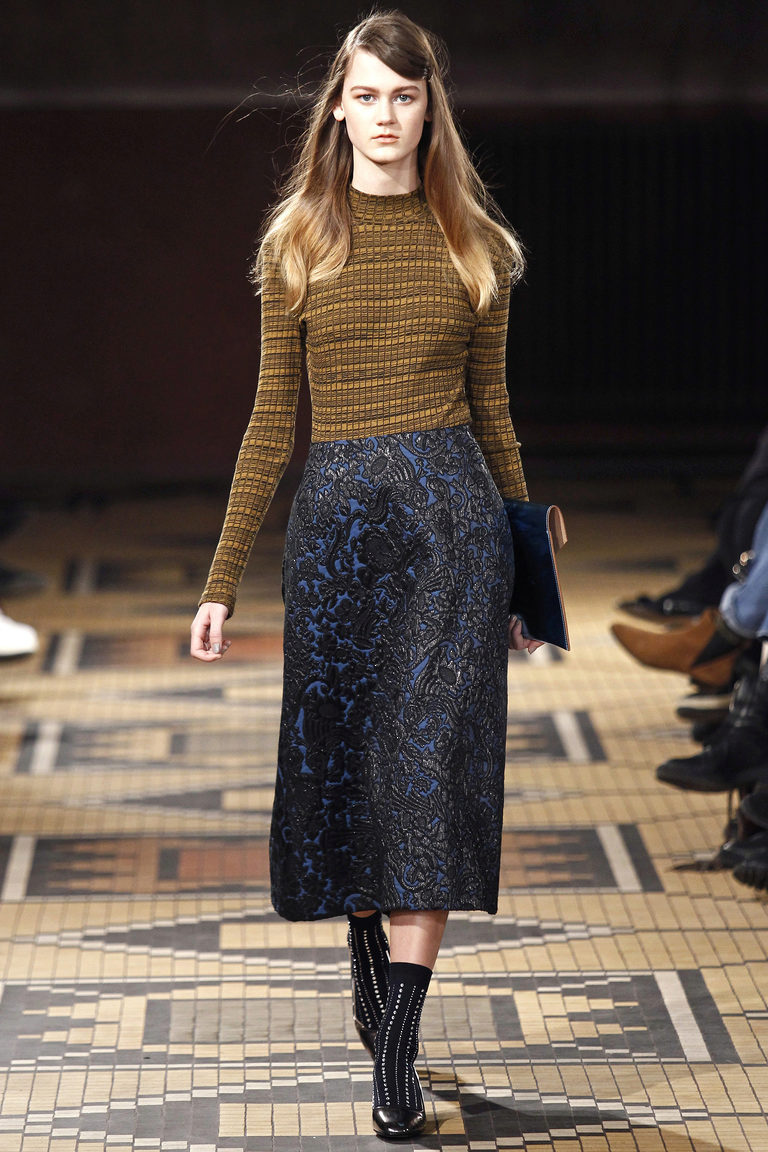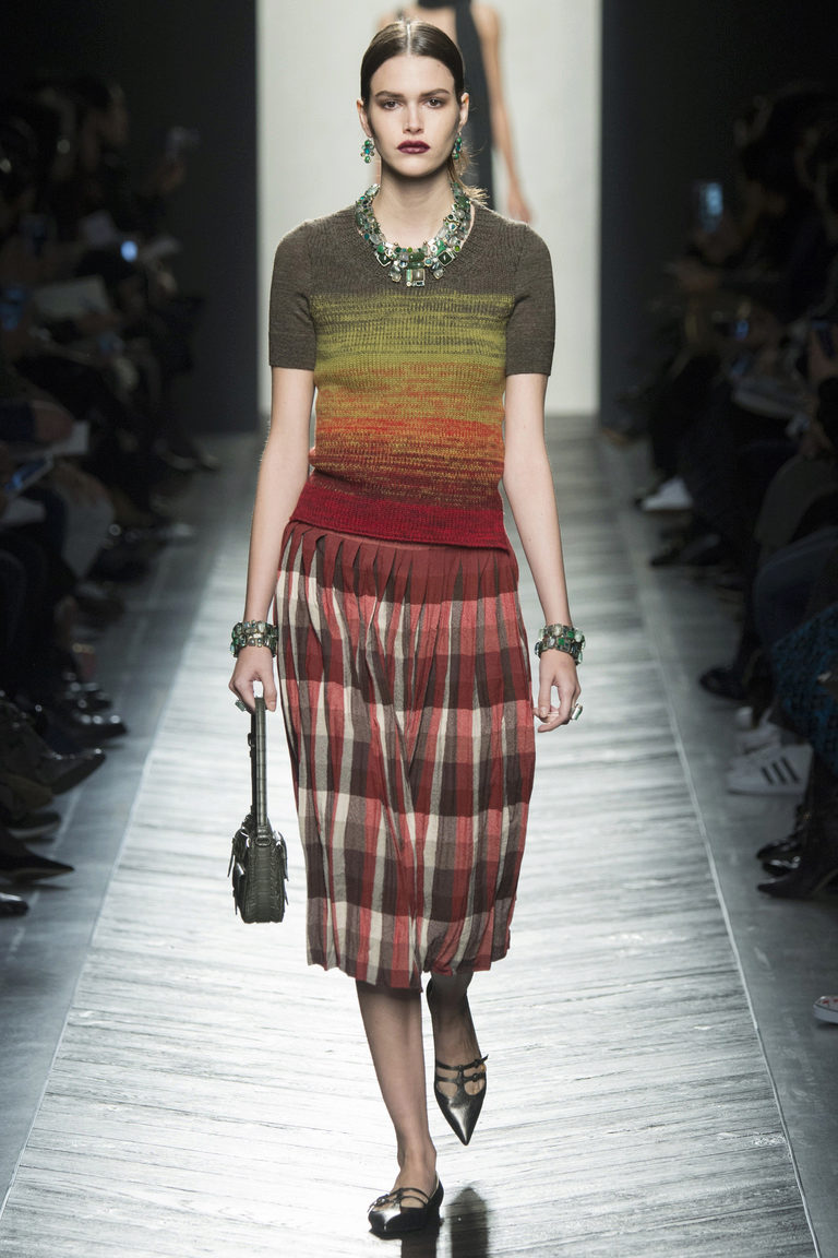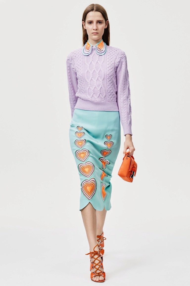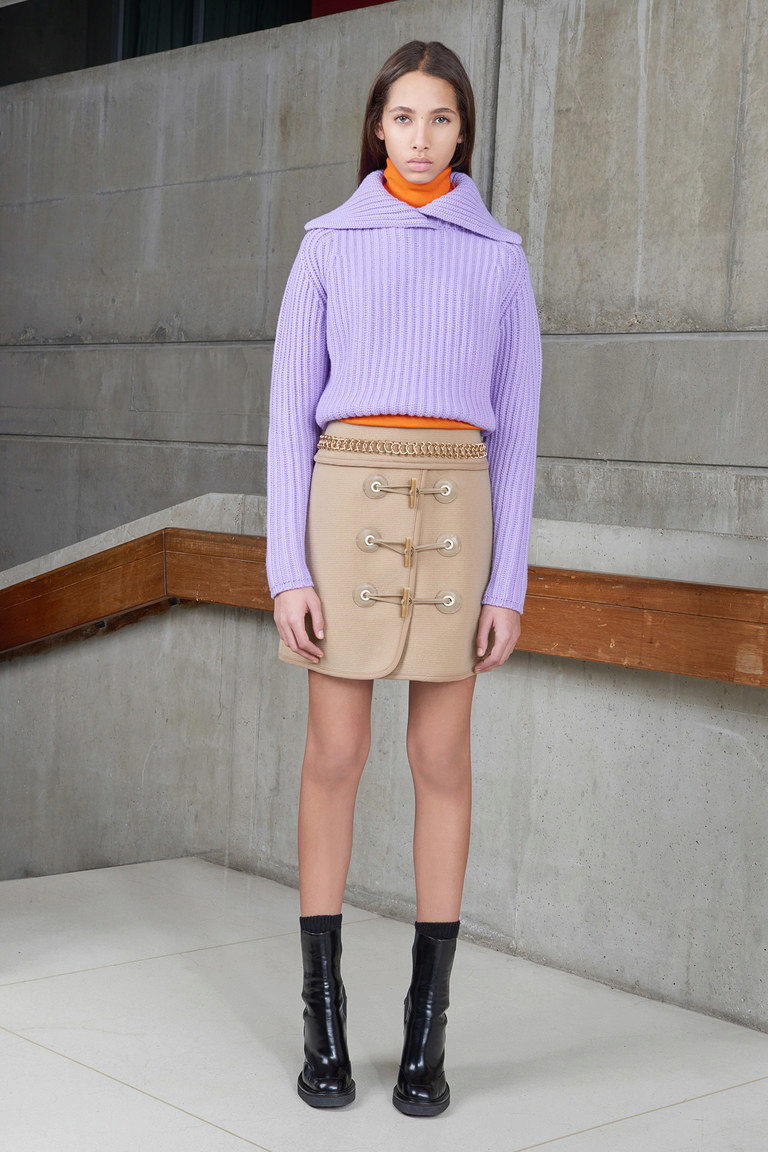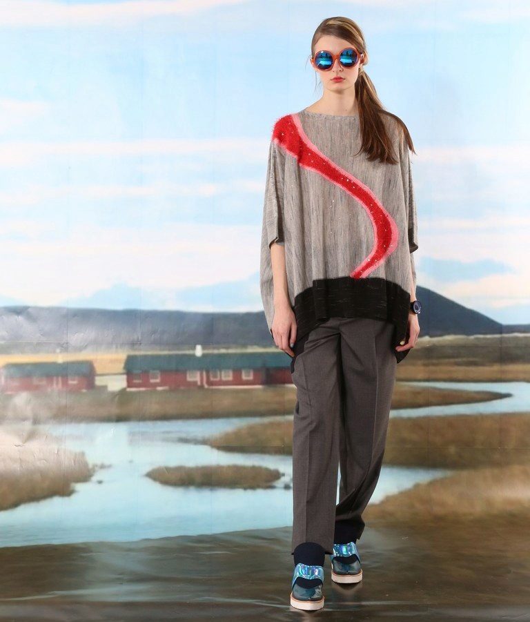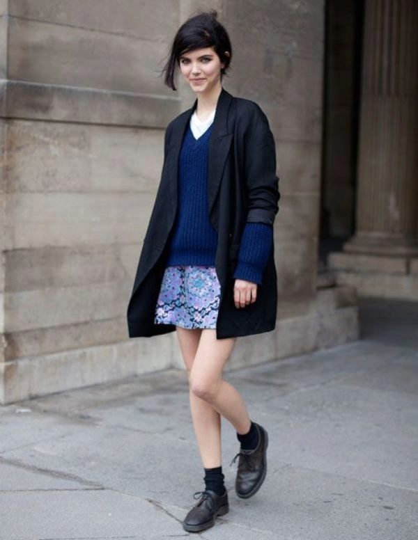 - Textured contrast: a blue knit pullover in a loose silhouette with a soft pale pink skirt and coarse brown boots. Vivid accents are a massive metal necklace, red-rimmed glasses and a blue postman bag.