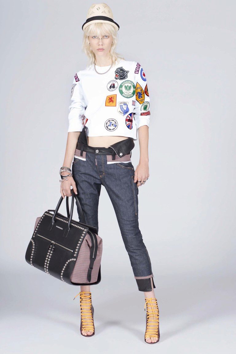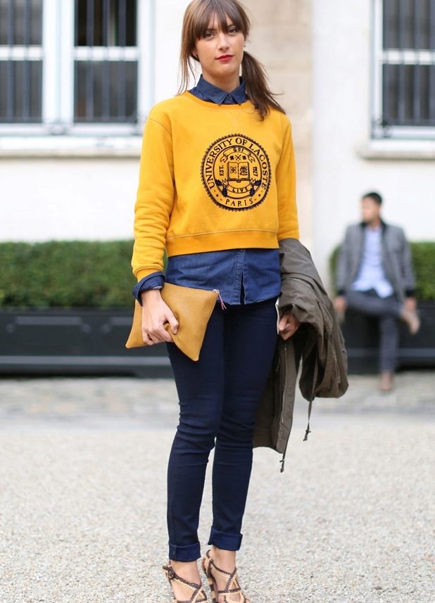 - Student Spring: A bright yellow cropped pullover with a university emblem is effective with a denim shirt and skin-tight blue jeans. The image is complemented by a small handbag in the pullover tone and black sandals.