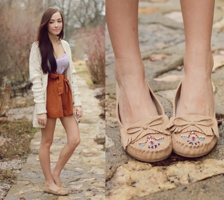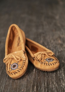 Until a certain time, moccasins were considered men's shoes, but now they are also part of the women's wardrobe. Stylish beige moccasins are very comfortable. They are made from suede or any other soft leather. The special cut and flexible sole provide comfort when walking.