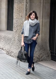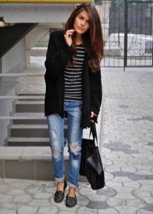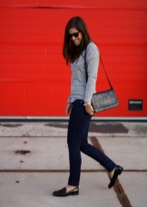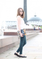 In the spring / autumn or on a cool summer day, moccasins can be worn under jeans of any cut and color. This is one of the most successful combination options. Top, T-shirt, turtleneck, long sleeve can be used as the top. From above you can put on a denim jacket or a windbreaker.