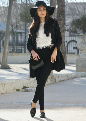 Laconic black leather moccasins will perfectly fit into the image of a successful business lady. They will effectively complement the set of a strict light sweater and a straight black skirt of medium length.