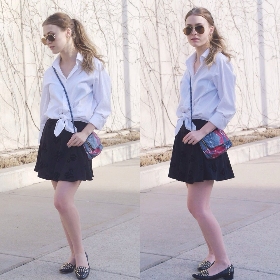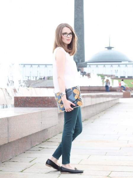 Leather moccasins on a wide heel resemble elegant shoes, so you can safely wear them to a white shirt and a fluffy mini skirt. A casually knotted shirt and rolled up cuffs make the image more frivolous and romantic. A bright multi-colored handbag over the shoulder helps to achieve this effect. Moccasins are complemented by metal rivets.