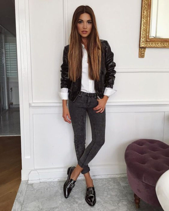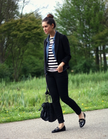 Black patent leather loafers are a great addition to a casual set of black jeans, a striped t-shirt, and a cropped jacket. This image always looks very interesting, stylish and fashionable.