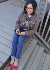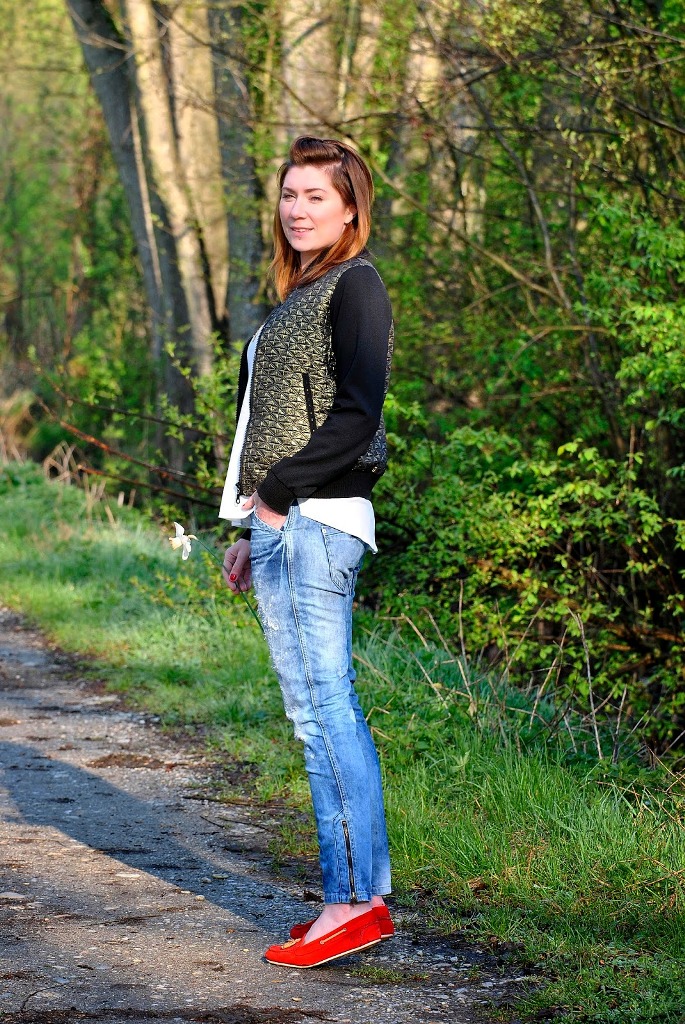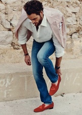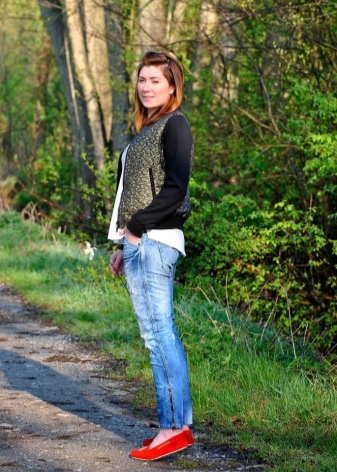 Red moccasins will look great jeans of almost any style. This tandem will allow you to create many comfortable, relaxed images for everyday wear, walking, traveling. The role of the top can play T-shirt, T-shirt, top, shirt, blouse, jumper, sweatshirt. A blazer, a sleeveless jacket, a denim jacket, a leather jacket, a sweatshirt can be thrown on top.