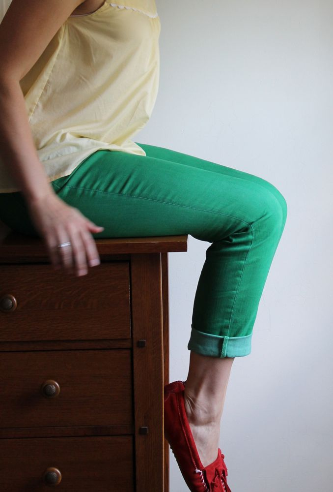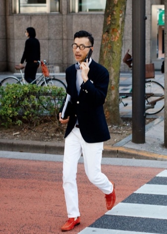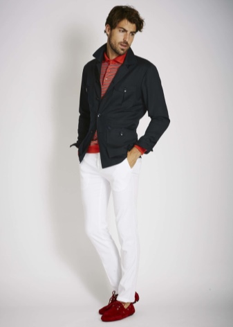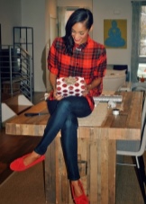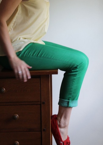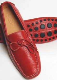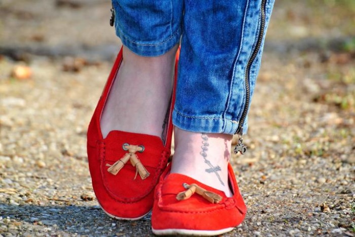 Best of all red moccasins will look with shortened skinny trousers in gray, black, white, beige. For bright stylish images fit models of yellow and green shades. In the summer, combine them with a blouse or a light chiffon top - get a stylish business look.