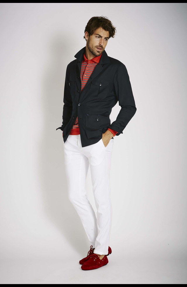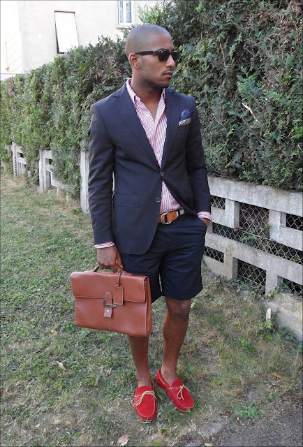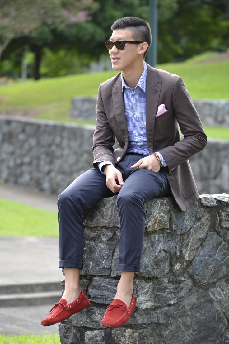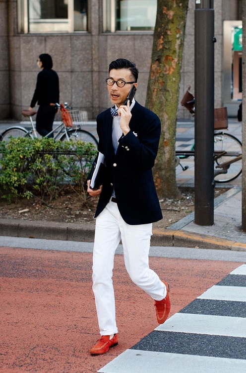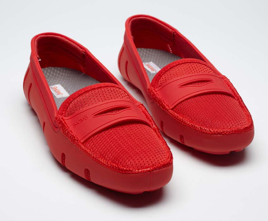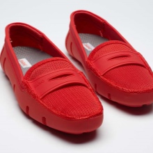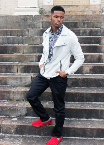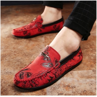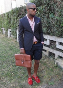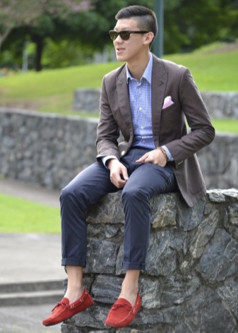 Red summer loafers will look best with blue or black denim shorts. For hipster onions, complement the look with a white T-shirt, plaid shirt and wyfarers. For a relaxed casual look, wear plain linen or cotton shorts, and a T-shirt can be a couple of tones lighter than the moccasins.