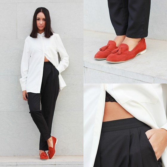 Stylish look in smart casual style. It is suitable for everyday wear, and for work in the office, in the absence of a strict dress code. Black skinny without decorative elements and scuffs, a white shirt in combination with a black jumper, bright red moccasins and black aviator glasses. The image is complemented by a voluminous black bag and a beige trench coat, it is hot in the afternoon, but it will come in handy on a cool evening.