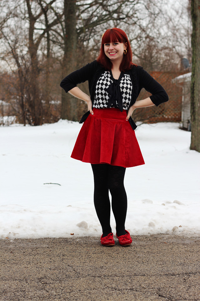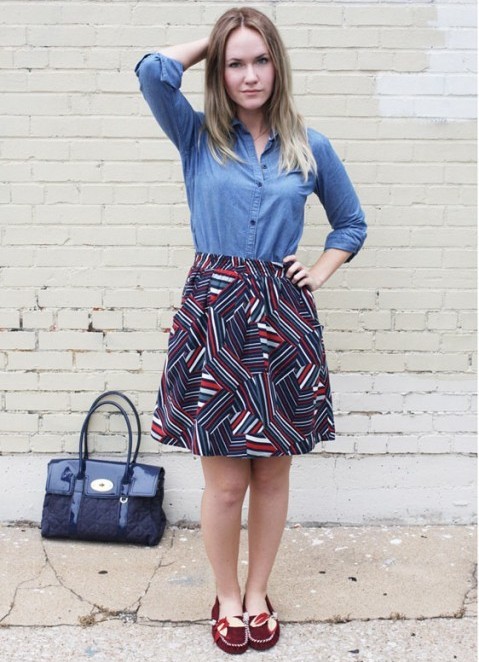 Wear loafers with a blue or black skater skirt or a flat denim mini skirt. You can wear it with any of the above top, adding a denim vest or a bomber jacket.
