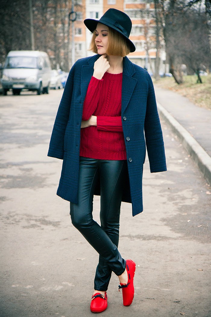 Relaxed casual look for spring. Navy blue pants, peach jumper, beige trench coat, red loafers and a brown bag with a long strap. Fervently, but moderately restrained - this image is suitable for study and for walking around the city.