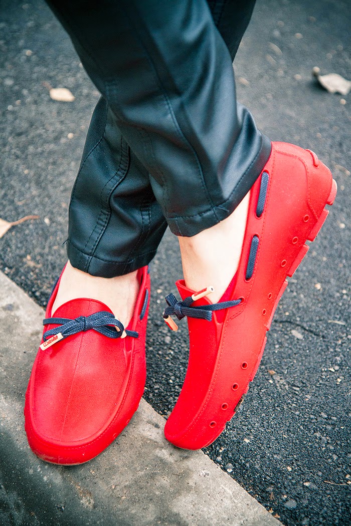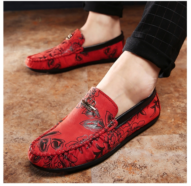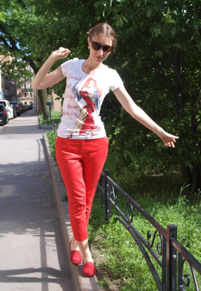 Combine red leather loafers with a light print t-shirt. Complement this look with red pants and stylish sunglasses. Look suitable for walking and meeting with friends.