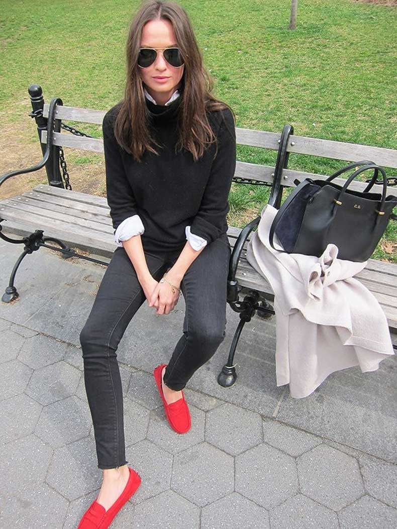 Red moccasins have already become part of urban folklore, so many women react to them with a smile and are in no hurry to make them part of their wardrobe. Despite the well-established stereotype, they look bright, spectacular and blend with almost any casual clothing. We hope that our article will help you to get rid of prejudices and give a chance to this stylish and comfortable shoes!