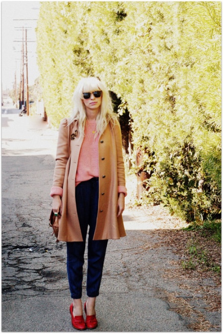 If you are going to wear loafers to work in combination with a business suit, you will have to combine them with a warm coat.You just need to abandon the models of classic cut, choose a coat-boyfriend, a coat-cocoon and any other model oversize.