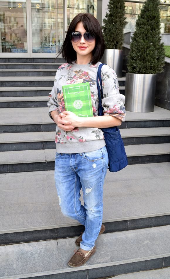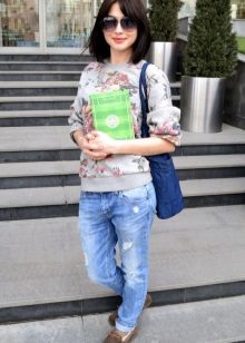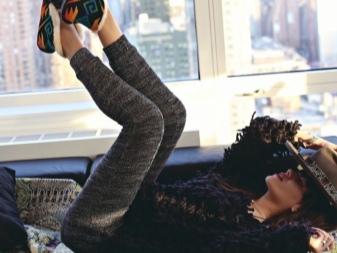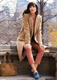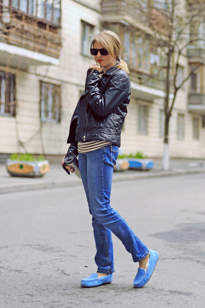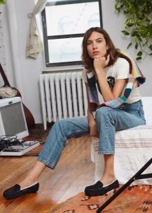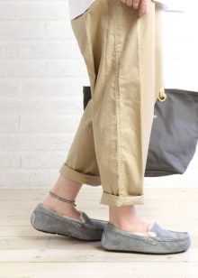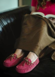 This shoe looks great with trousers and jeans, narrow or flared to the bottom. Although stylists do not recommend moccasins under the skirt, but with a warm model of a free cut or ethnic style it is quite acceptable.