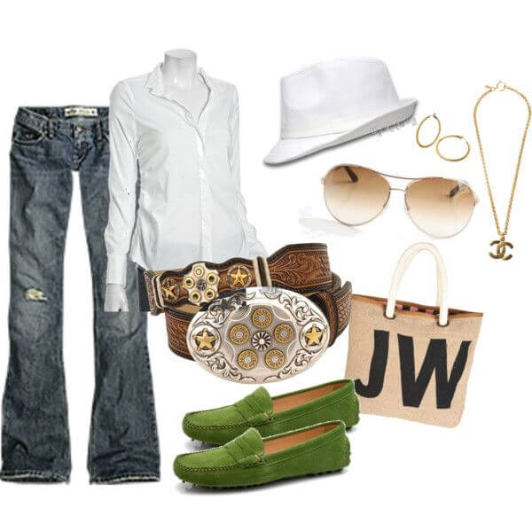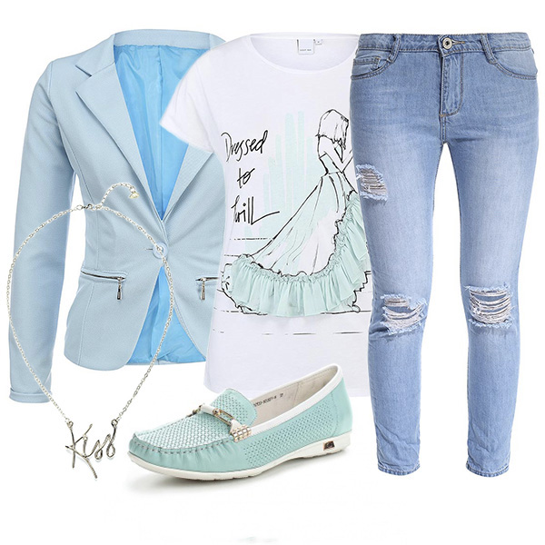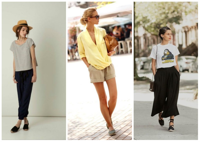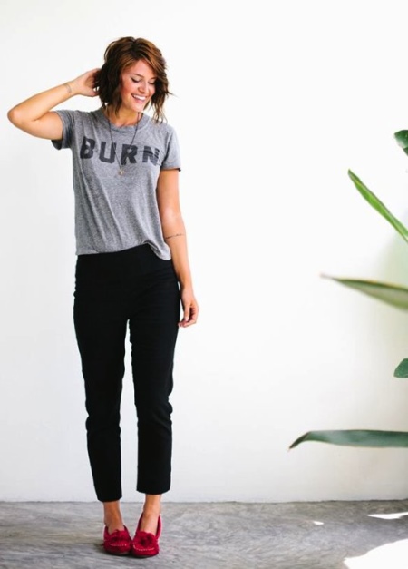 - In order not to suffer from the hot weather, you should choose thin blouses and light pants. In combination with suede moccasins of white color, the image will look advantageous and elegant.