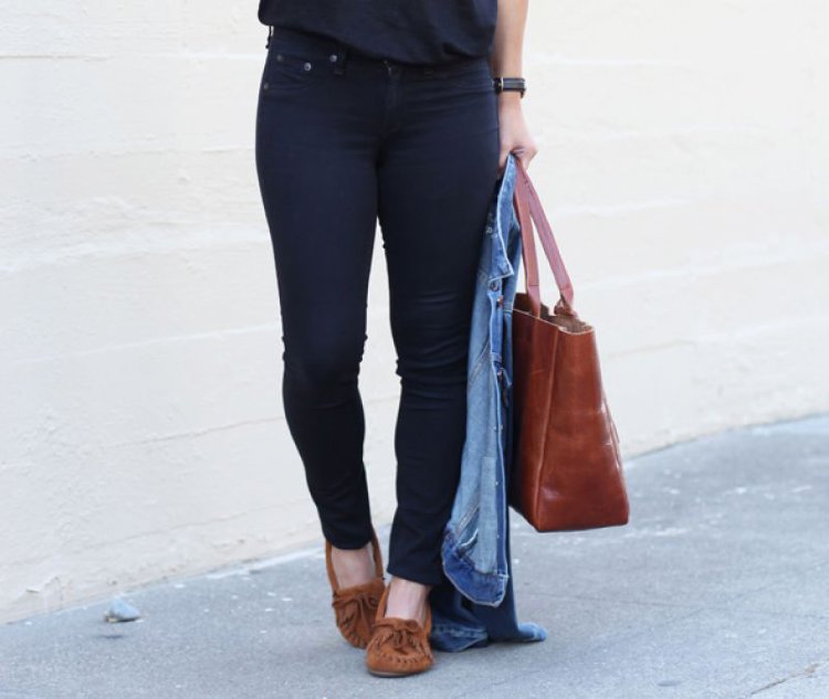 - Moccasins are suitable for creating sports bows, although running in stadium shoes is not recommended. If you have an active day that requires many hours of movement, suede moccasins will replace models with heels. Without the slightest discomfort, you quickly cope with affairs. Linen T-shirts, tight T-shirts and skinny jeans are suitable for clothing.