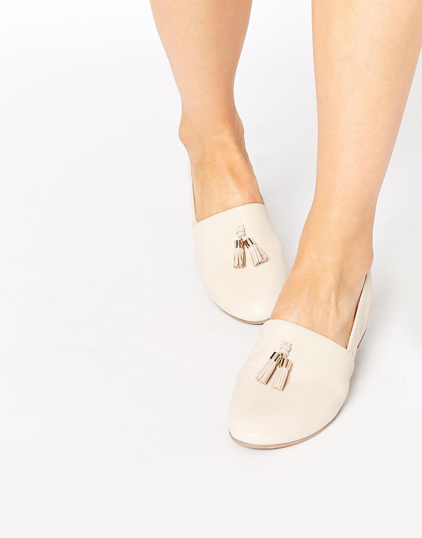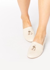 However, unlike these types of shoes, such moccasins will have an elongated, rounded toe and a flat sole without a heel, which will make them a very successful addition to light and laid-back bows.