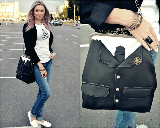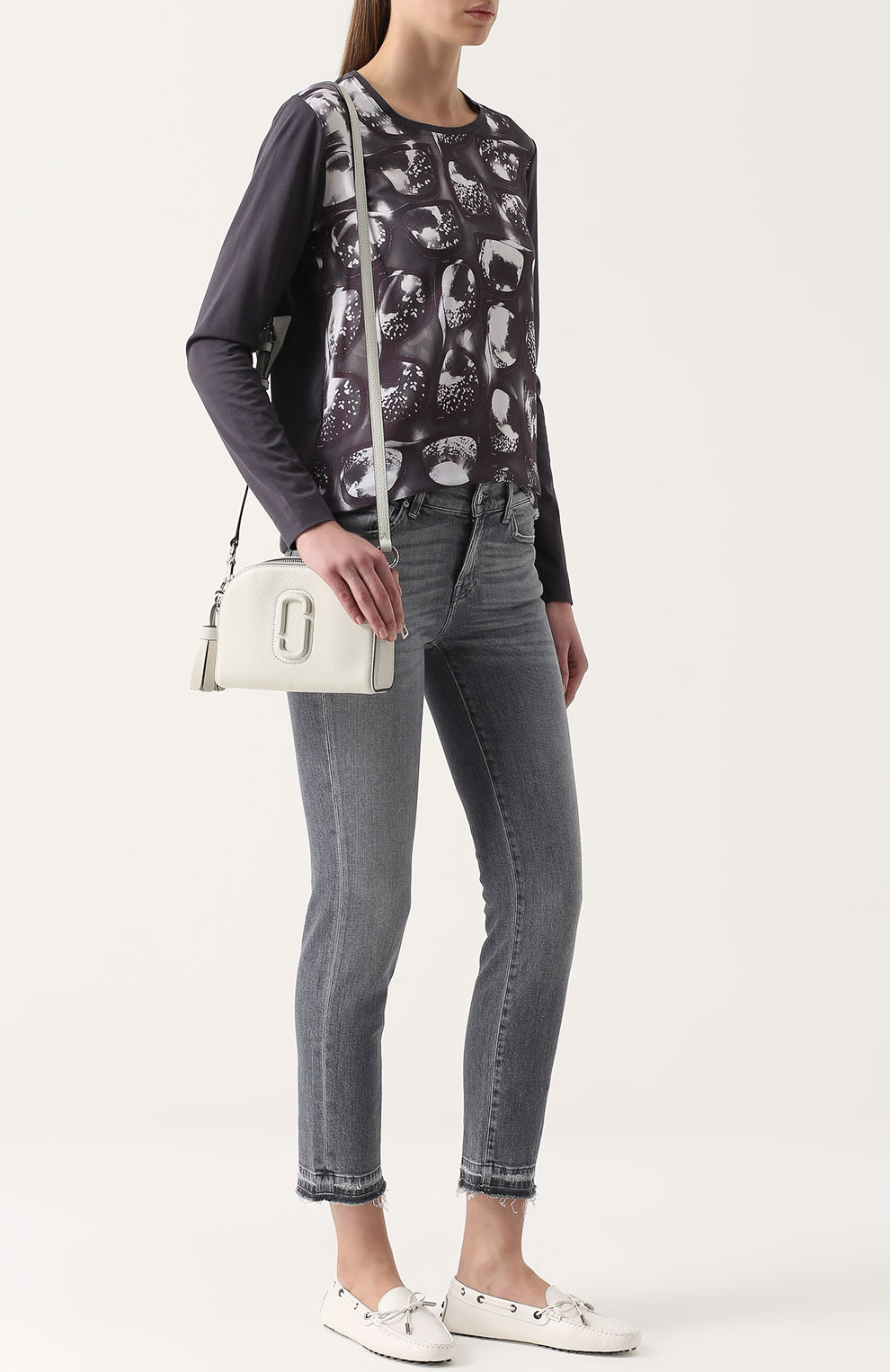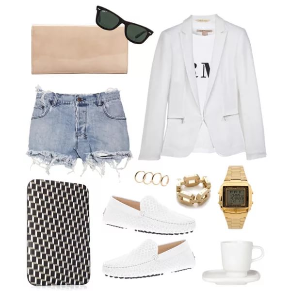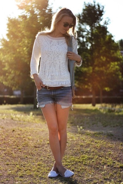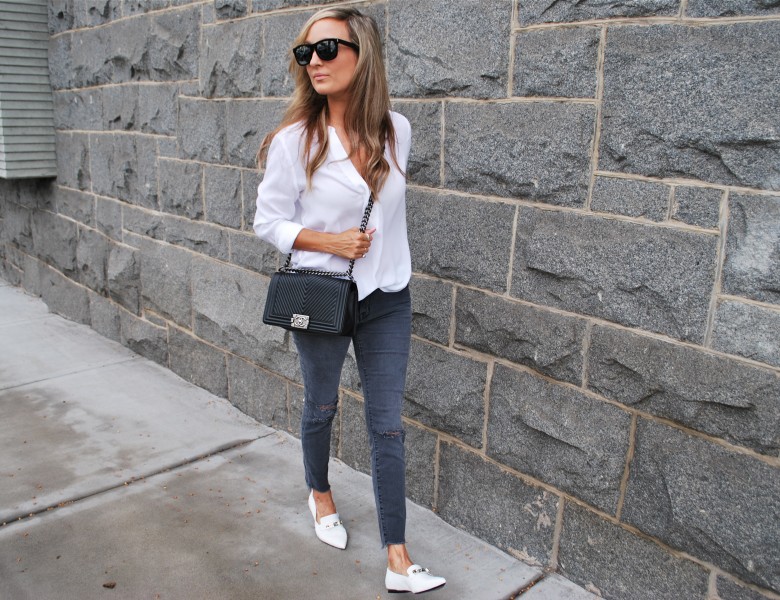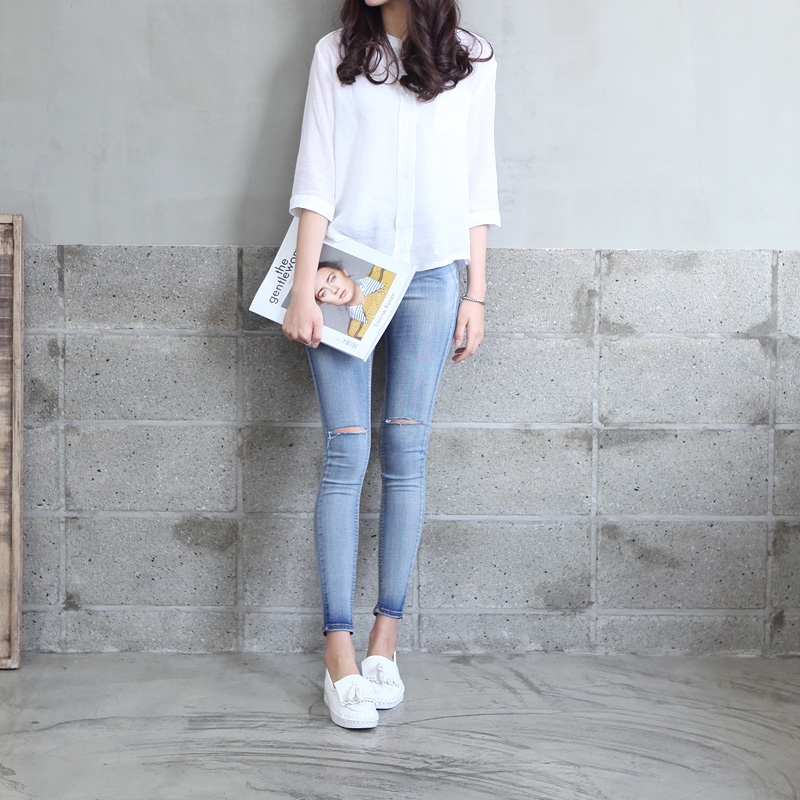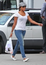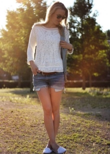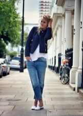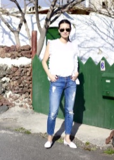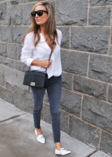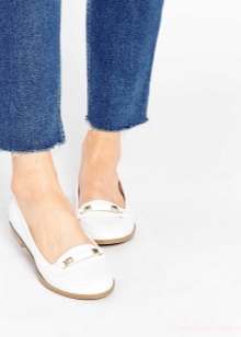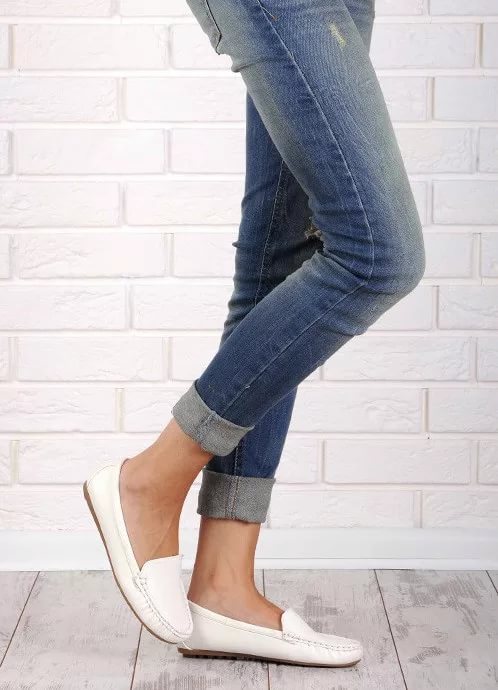 City bow loves jeans, which will be perfectly combined with white moccasins, regardless of style and cut of both. For a casual look, ripped off light skinny jeans can be used in combination with a classic model, and t-shirt with a bright print or pattern.
