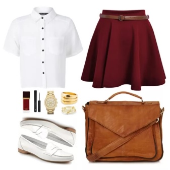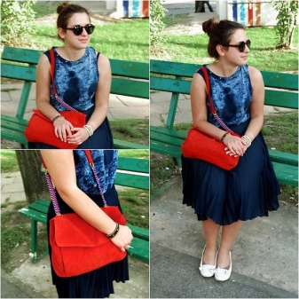 This may be a bell skirt or a-line above the line of the knees. As a top, you can use anything that does not belong to a formal or business elegant style: a t-shirt, turtleneck, tank top, top, or a shirt with an intricate print.