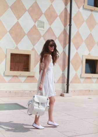 White leather moccasins will be able to become a worthy adornment of the summer look, consisting of a light maxi length sundress with a fitted silhouette and a voluminous light skirt. A small clutch on a long strap and headband-headband will be able to adequately complete this bow.