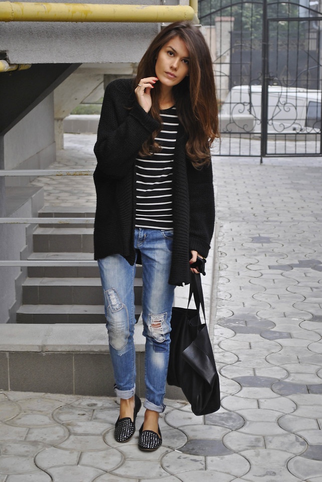 - Black. With black moccasins you can create a very bold image, for example, a black leather jacket and motorcyclist gloves are suitable for them. But if you are not ready for such an image, then black pants will suit you, but you should not wear a skirt or dress to such shoes, black moccasins look bad against the background of open legs.