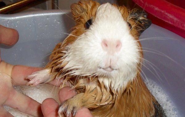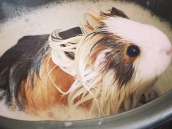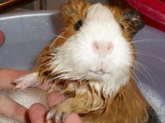 From time to time, the guinea pig needs to be bathed with a special shampoo for animals, after which it is soaked with a warm towel and dried with a hairdryer (keep it away so that too hot air does not burn the little animal).