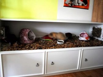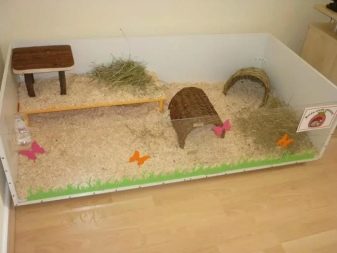 You can use almost any materials and elements. Of the building materials that are prepared for housing the animal, you can make a food part, a feeding trough and a house. If there are bars, you can make bunk beds. It is necessary to bend them and fasten with ties to the edges of the dwelling.