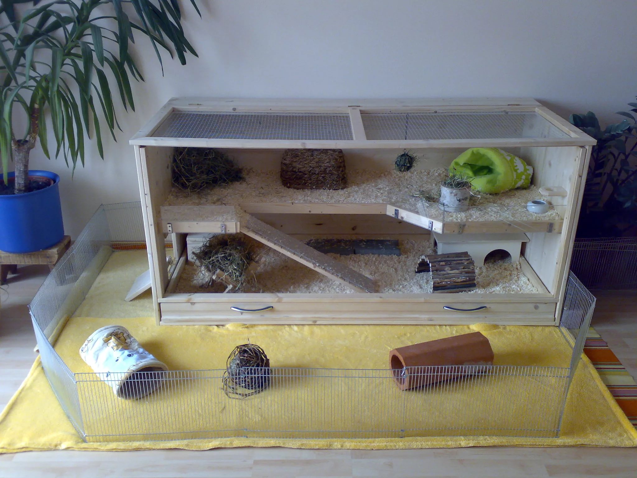 Items inside the dwelling should be well attached to the walls or located on the floor.Inside the cage, it is necessary to place a drinking bowl, a feeder, a hay tray, toys, and wooden sticks. Also for the animal, you must provide a place for privacy.