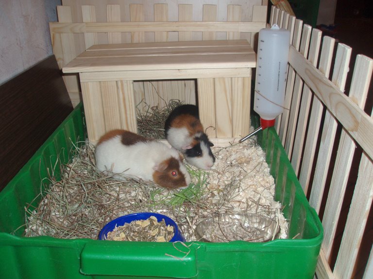 The only drawback is the daily cleaning of the area near the cage, as the guinea pigs throw out sawdust, food and garbage through the grids.