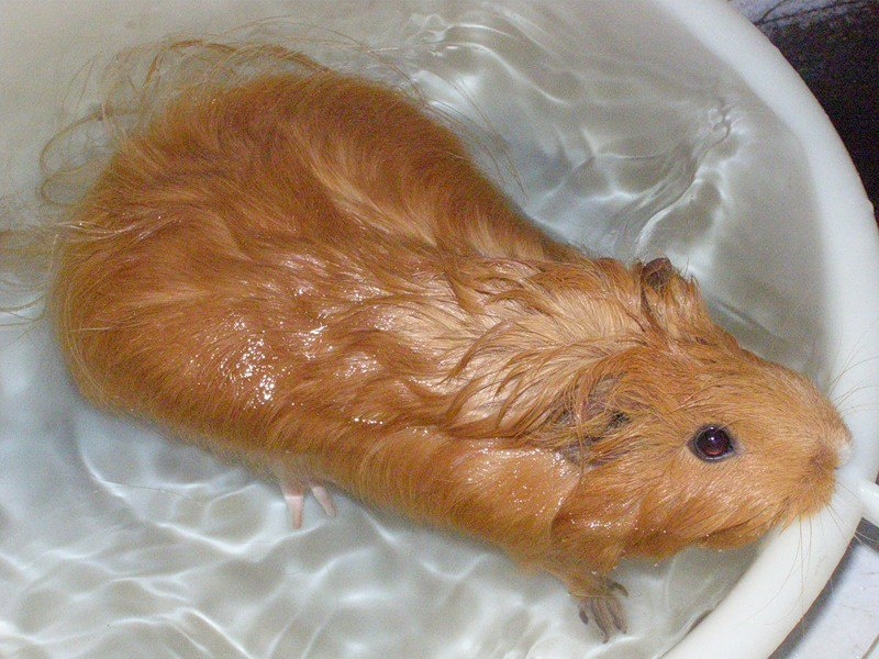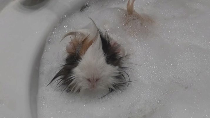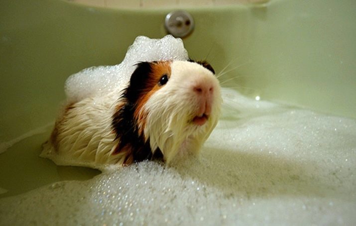 And although most guinea pigs try to avoid swimming, there are specimens among their brethren who take a bath with pleasure. If the owners treat them gently, if the water is comfortable for the animal, the eyes do not sting, it is relaxed and calm, the animal will take a good swim. It may even purr and whistle from pleasure.