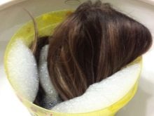 For washing wigs use boiled cooled water. Some add soda to it. When washing, a little shampoo is poured into a basin with warm water, foamed and the product is immersed for 15–20 minutes. After that, it should be rinsed in water at room temperature, acting very carefully, without trying to wash like clothes by hand washing, twisting and plop in the liquid.If there is dirt on the wig that does not leave, for example, the remnants of cosmetics, you can take a toothbrush with very soft bristles and gently handle such a place.