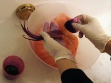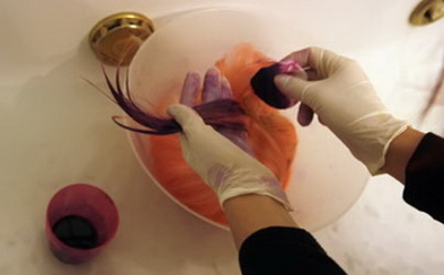 Another option is to use paints that paint on fabrics. In this case, make a solution so that in 1 liter of water accounted for a jar of dye for batik. Then a wig is placed in the resulting liquid for two days. After painting is complete, it should dry for at least 24 hours.