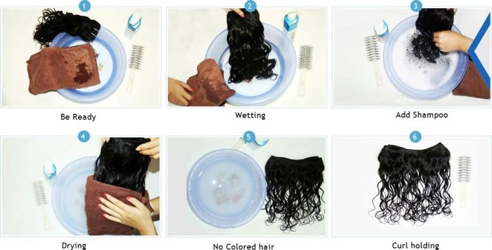 Wig or chignon need to be washed with a special shampoo for synthetic hair and dried on a special stand or loosely and unfolded. Such curls are capable of “remembering the shape,” and if they are dried up in a crumpled form, then creases may occur. In addition, after the strands will be hard to comb. The temperature at which it is necessary to wash artificial wigs is 15-20 degrees.