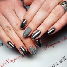 - Black version with rubbing. Rubbing - is, in fact, microblastic, they are applied on a sticky layer of gel or varnish using a soft sponge, creating a mirror effect. With the help of rubbing, various effects are created from ombre to holography.