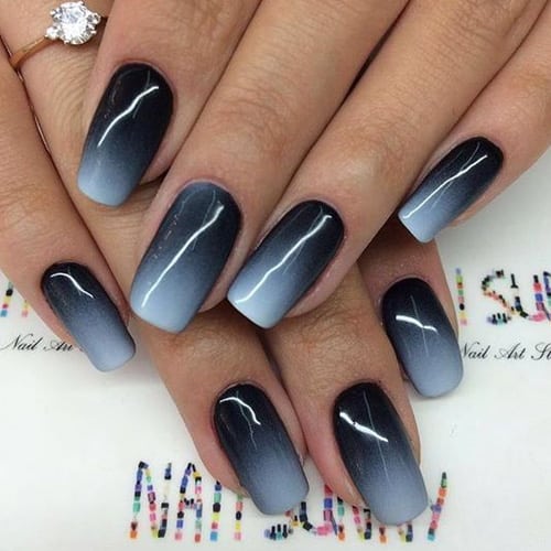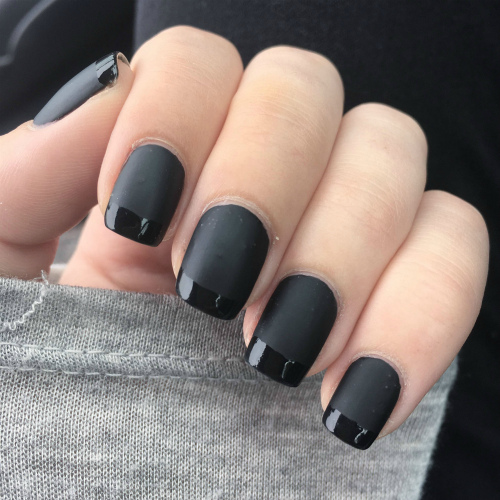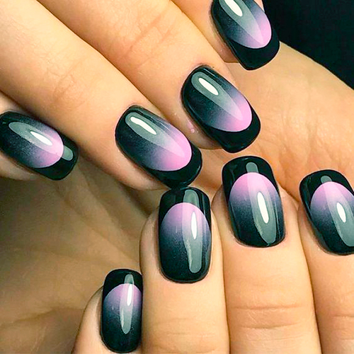 - Ombre. Stretching color can be created using black and color varnishes, starting from the tip or vice versa. The effect of ombre looks original when combining textures - from matte to gloss. The length of the nail for such a technique is better to grow.