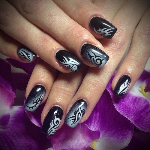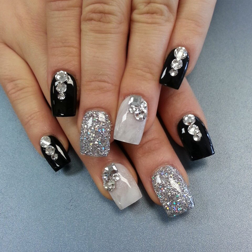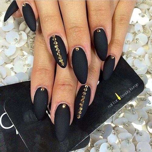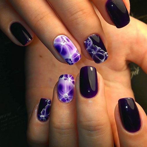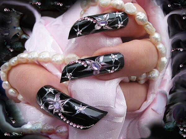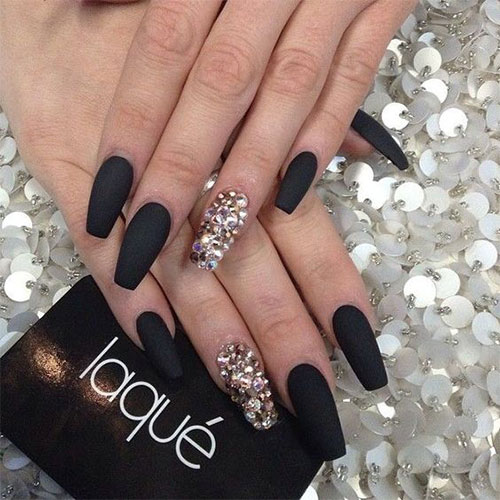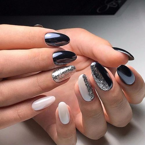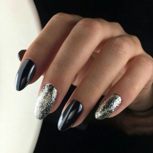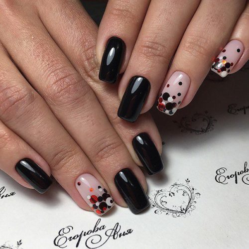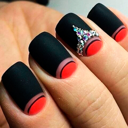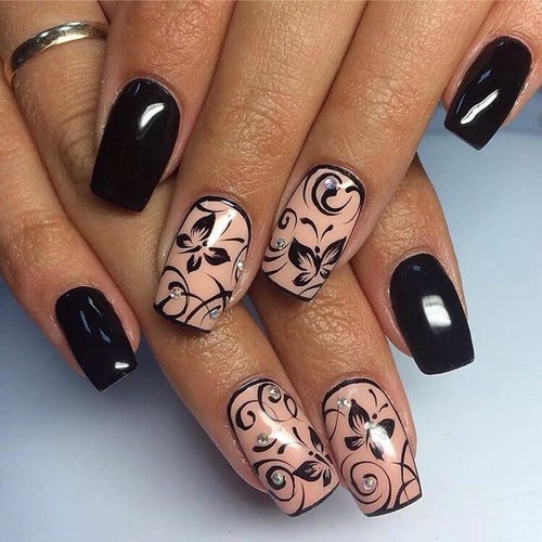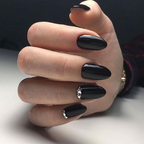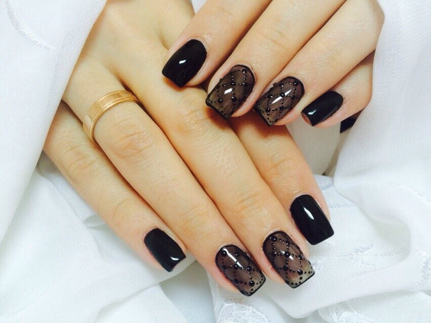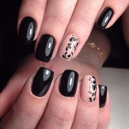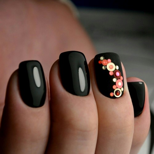 Black manicure is no longer readable as gloomy or “vampiric”. Fashion trends dictate new textures and designs that make it modern and luxurious. The finish can be matte, glossy, with the effect of velor and "broken glass". Abundantly used patterns, decorative rhinestones and kamifubuki.