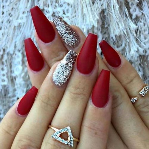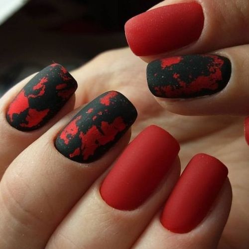 - Manicure with red. It is preferable to use on long nails or short, with the shape of a soft square. An interesting idea is the red staining of the inner surface of the free edge of the nail. The combination of matte dark and red glossy coatings is well combined.