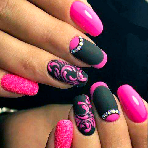 - Pink design. This manicure originated in the emo subculture. To date, this combination of colors is considered spectacular and catchy. Pink lacquer is used in all tones, from light pastel to rich fuchsia. French or moon manicures look extravagant with pink tips or moonlaces.